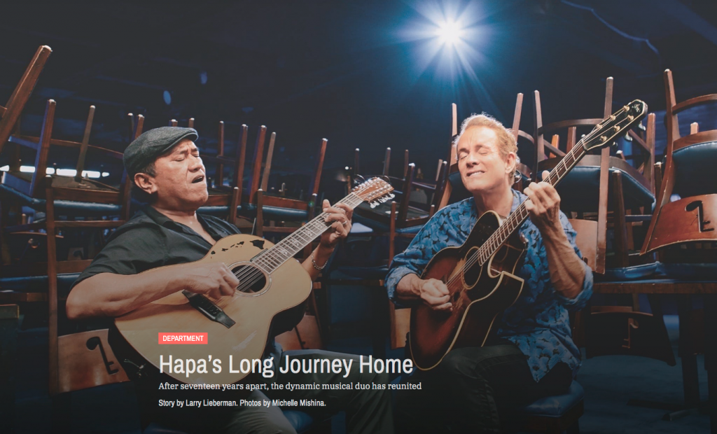 READ MORE Big Island Music Mag - In the Name of Hapa BY STEVE ROBY ON FEBRUARY 1, 2020 Everyone who’s heard Hapa’s self-titled 1992 debut release knows that Barry... READ MORE Hana Hou! - Hapa's Long Journey Home After seventeen years apart, the dynamic musical duo has reunited Story by Larry Lieberman. Photos...